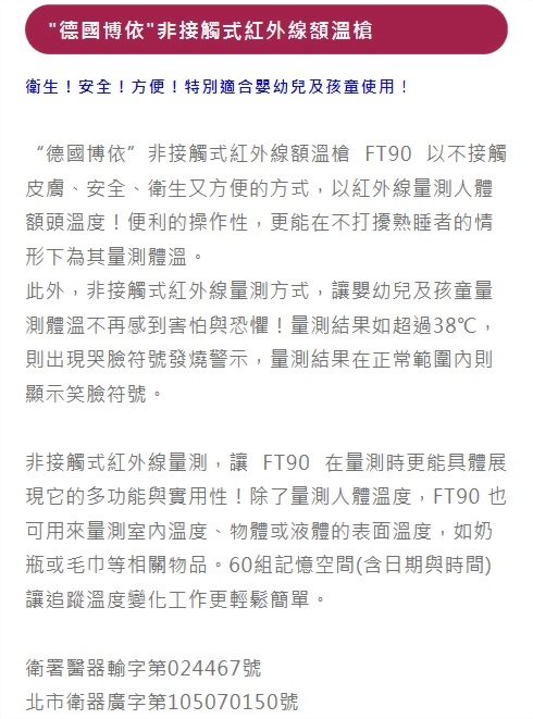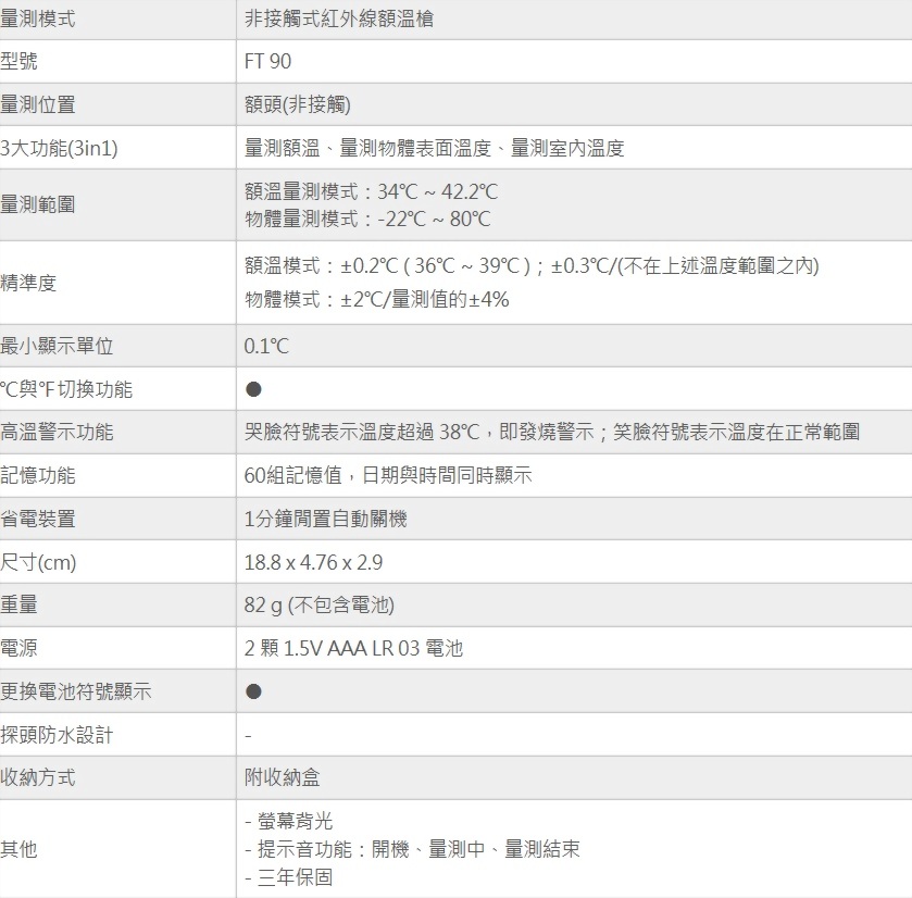 beurer德國博依 非接觸式紅外線額溫槍. FT90 型號 : FT90 數量 : 加入詢價車 產品敘述 尺寸:18.8x4.76x2.9cm 重量:82g(不含電池) 相關產品 Rossmax優盛 紅外線額溫槍. HC700 Model : HC700 BRAUN百靈耳溫槍. IRT6525 Model : IRT6525 NISSEI日本精密 紅外線耳溫槍. MT-36LBJ Model : MT-36LBJ NISSEI日本精密 迷你耳溫槍. MT-30CPLB Model : MT-30CPLB BRAUN百靈 耳溫槍. IRT3030 Model : IRT3030 FORA福爾 紅外線耳溫槍. IR18 Model : IR18