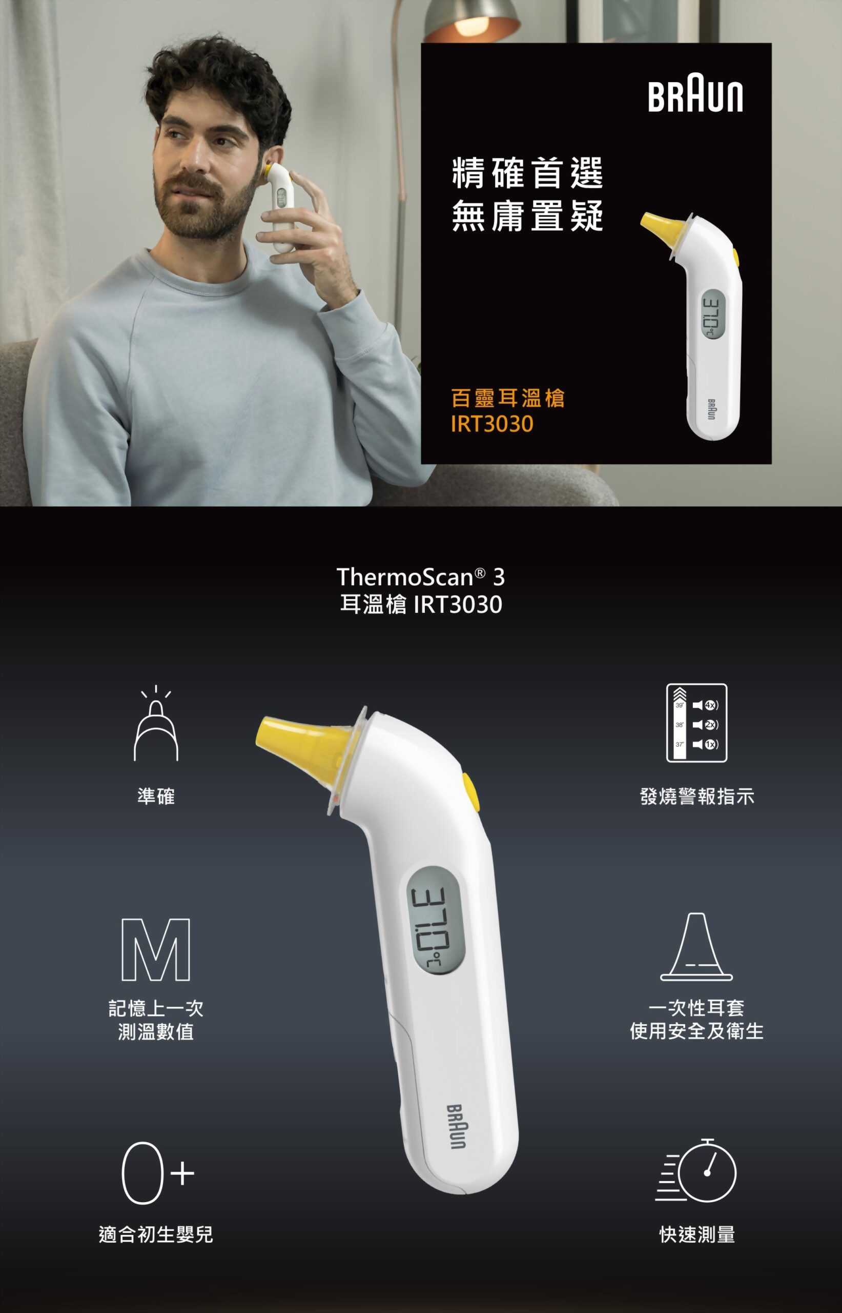 百靈 ThermoScan 是利用探測耳膜及周圍組織所發出的紅外線熱量來測量溫度,專業的溫度探測,可以即時且準確反映出體內核心溫度的變化,幫助媽媽照護孩童。