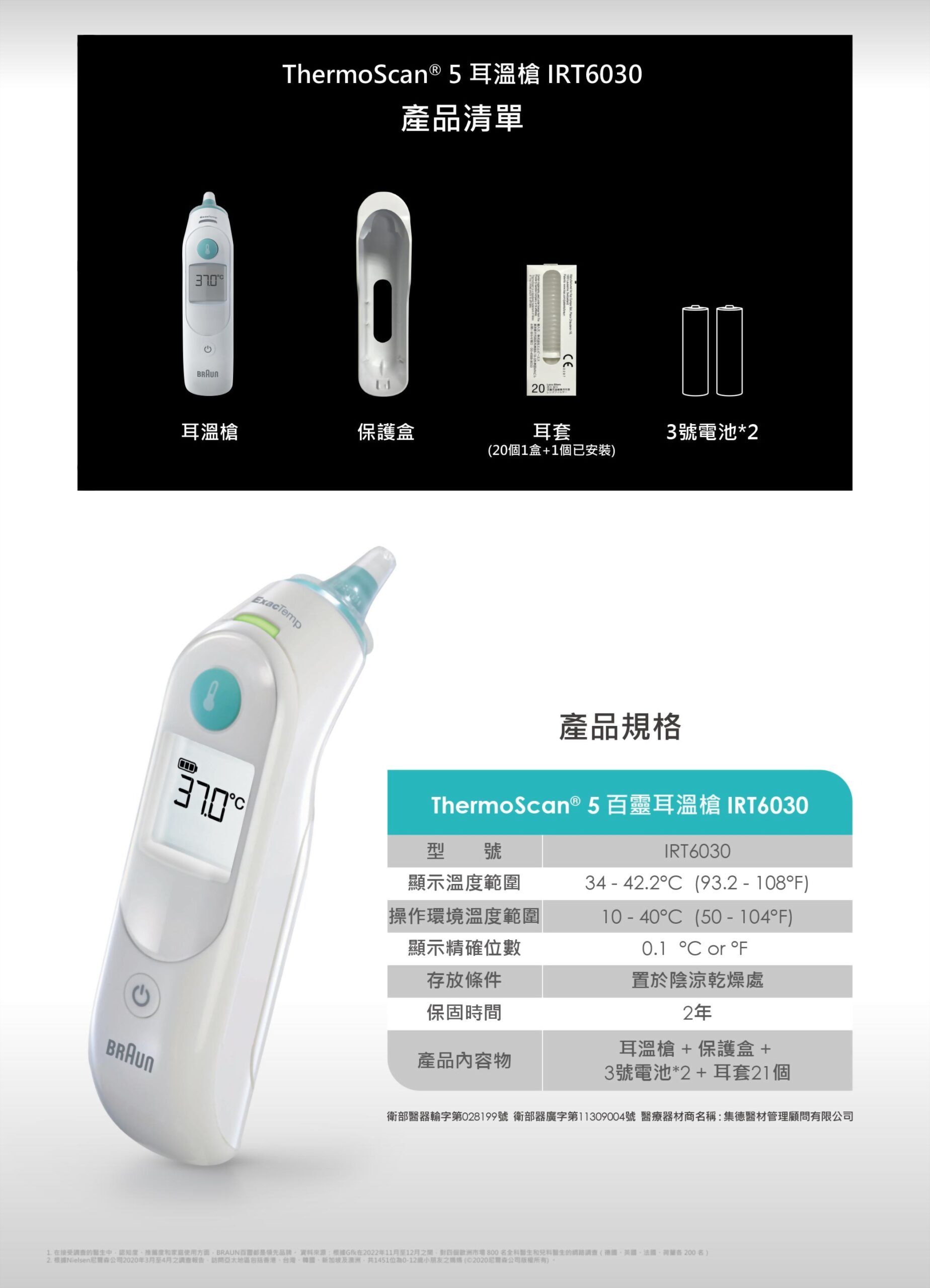 BRAUN百靈 耳溫槍. IRT6030 型號 : IRT6030 數量 : 加入詢價車 產品敘述 • 預熱測溫頭 • 獨特的位置偵測系統 • 夜光功能 • 記憶功能 使用方法 從保護盒上取出耳溫槍。 按下電源按鈕。 裝上新耳套。 把測溫頭伸入耳道。 按下並鬆開測溫按鈕。 顯示體溫。 每次測溫前請更換新的耳套以確保準確性及衛生。 相關產品 NISSEI日本精密 迷你耳溫槍. MT-50LL Model : MT-50LL NISSEI日本精密 迷你耳溫槍. MT-50LW Model : MT-50LW FORA福爾 紅外線額溫槍. IR42 Model : IR42 NISSEI日本精密 紅外線耳溫槍. MT-36LRJ Model : MT-36LRJ BRAUN百靈耳溫槍. IRT6525 Model : IRT6525 NISSEI日本精密 紅外線耳溫槍. MT-36LBJ Model : MT-36LBJ