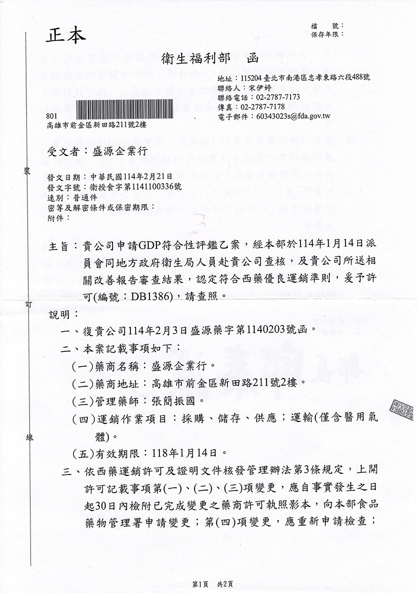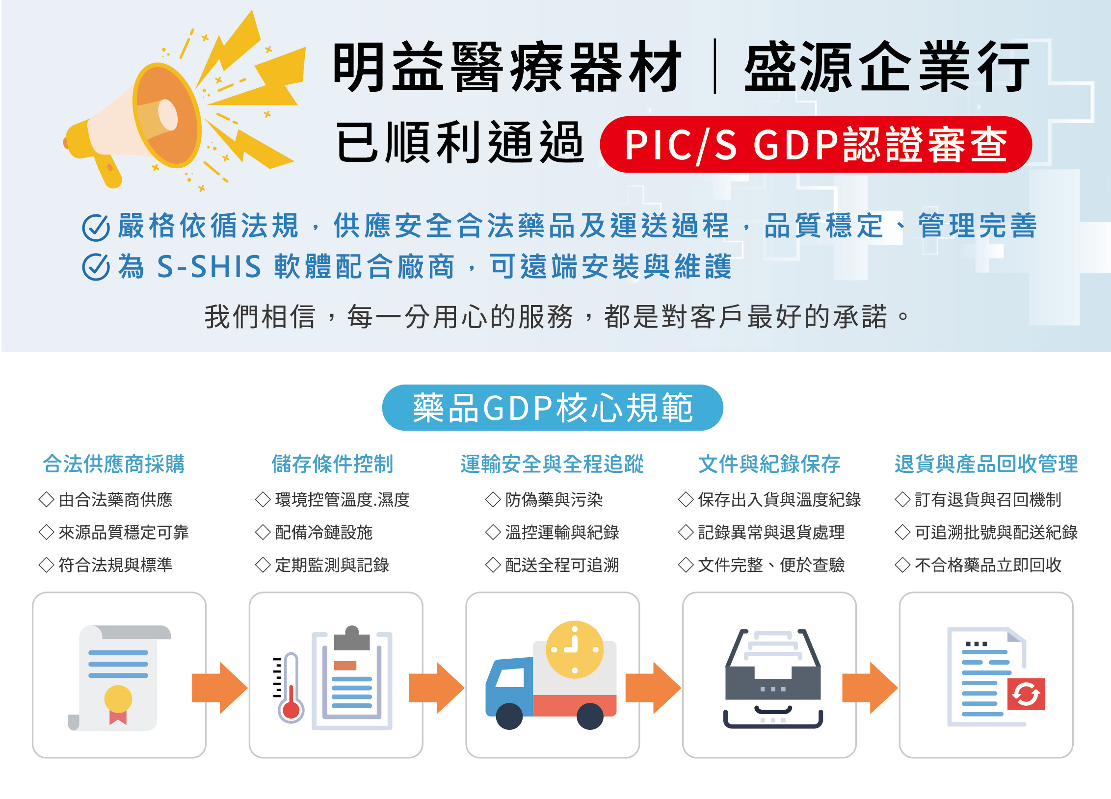 【重要消息】 明益醫療器材│盛源企業行 已通過PIC/S GDP認證審查 [2025-06-11] 明益醫療器材│盛源企業行 已順利通過PIC/S GDP認證審查 ★ 嚴格依循法規,供應安全合法藥品及運送過程,品質穩定、管理完善 ★ 為 S-SHIS 軟體配合廠商,可遠端安裝與維護 我們相信,每一分用心的服務,都是對客戶最好的承諾。 >>回上一頁