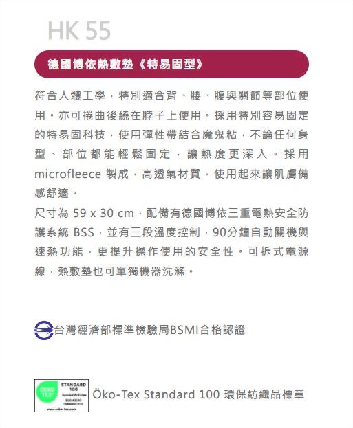 尺寸為 59 x 30 cm,配備有德國博依三重電熱安全防護系統 BSS,並有 3 段溫度控制,90 分鐘自動關機與速熱功能,更提升操作使用的安全性。可拆式電源線,熱敷墊也可單獨機器洗滌。
