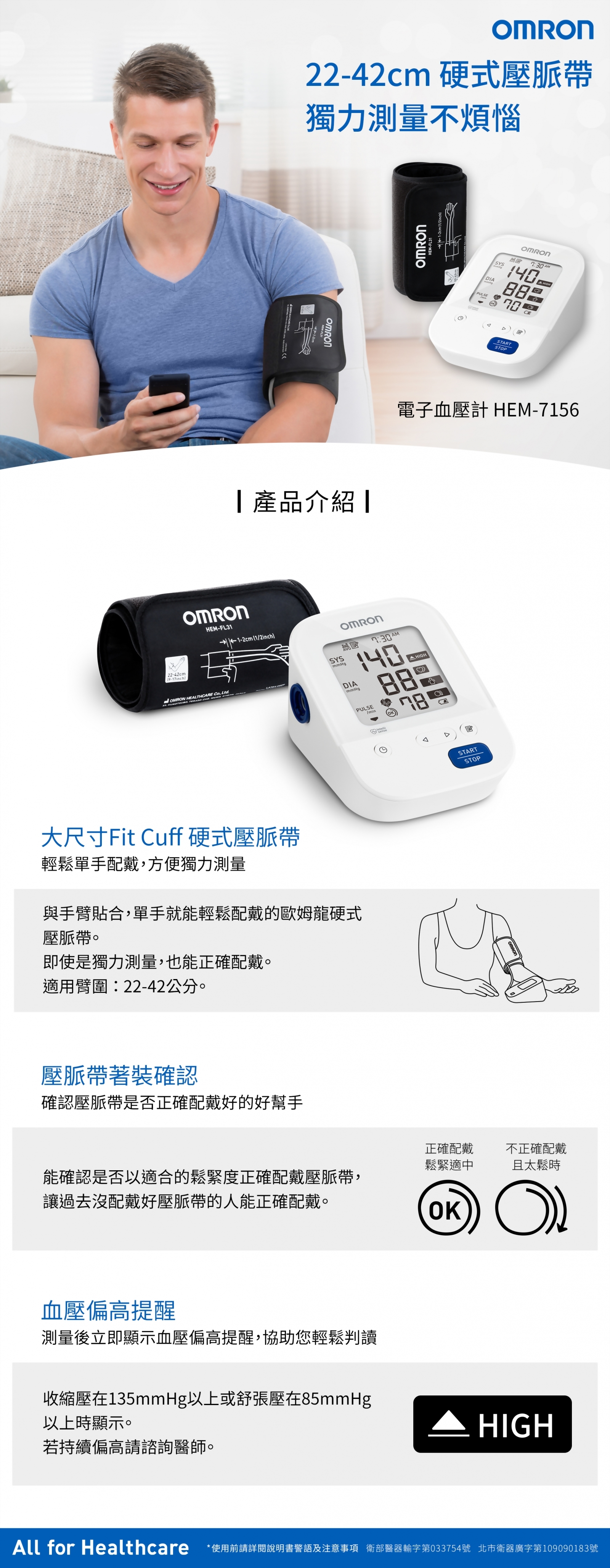 OMRON歐姆龍 手臂式血壓計 HEM-7156(越南製) 型號 : HEM-7156 數量 : 加入詢價車 產品敘述 規格 保固:3年 壓脈帶型式:ML硬式壓脈帶 適用臂圍:22~42cm 記憶組數:60組×1人 壓脈帶著裝確認 不規則脈波檢測 身體晃動檢測 高血壓警示 十分鐘內三次平均值 時間顯示 收納方式:軟袋收納 變壓器:選購 電池:AA×4顆 產地:越南 外型尺寸:約105×85×152mm 主機重量(不含電池):約337g 北市衛器廣字第109100056號 相關產品 歐姆龍 藍牙電子血壓計 JPN-616T(日本製) Model : JPN-616T OMRON歐姆龍 藍牙電子血壓計 JPN-616T(日本製) Model : JPN-616T
