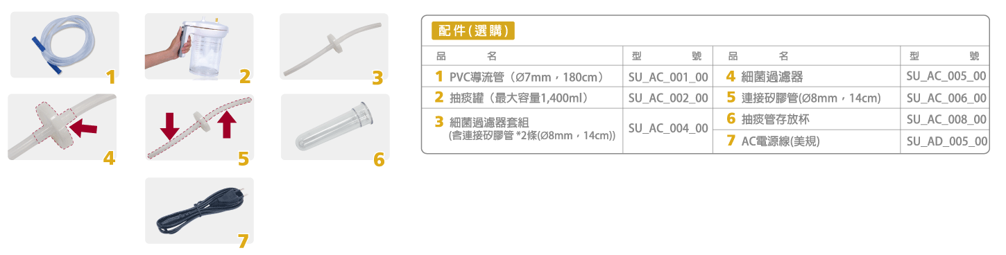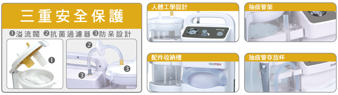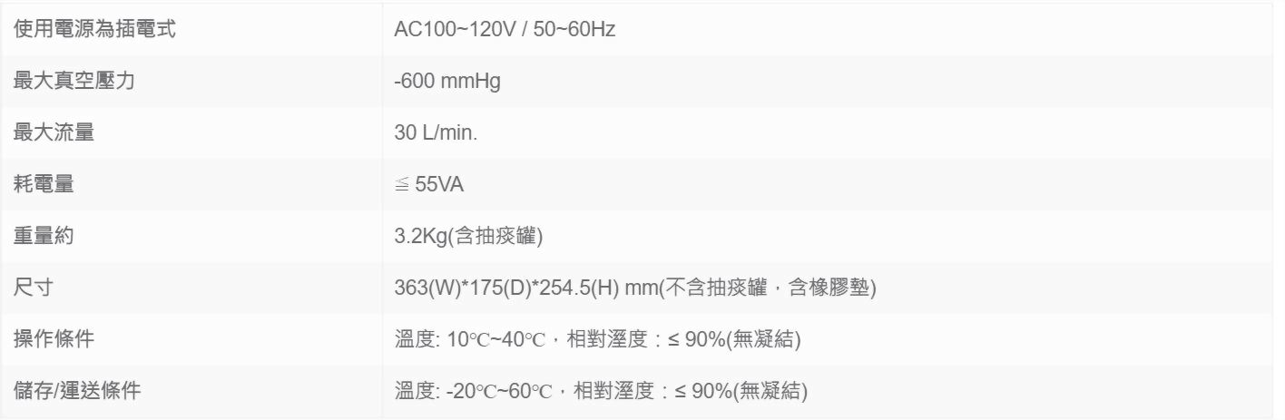 抽痰機-高階款 型號 : V5 數量 : 加入詢價車 產品敘述 規格 功能 擁有三重保護之設計,(1)溢流閥加上(2) 抗菌過濾器和(3)防呆設計,可防止流體和空氣中的污染物倒流進入馬達。 標準配置抽痰罐容量為1,400 CC,抽痰罐獨一無二的把手與上蓋開啟鈕設計,讓操作人員安全又輕鬆的去除汙物與清洗、組裝。 貼心的導流管收納室與抽痰管支架、抽痰管存放杯的設計,使用者可適當又衛生的 存放使用前或使用後的導流管與抽痰管。 具備人機工程學視角的綜合儀表板,可確保操作的正確與順暢。 許可證字號: 衛部醫器製字第006683號 廣告字號: 北市衛器廣字第109110214號 相關產品 雃博倍護交直流兩用抽痰機 VacPlus Model : VacPlus "磊仕" 氧氣濃縮機(攜帶型) Model : PHILIPS SimplyGo 歐姆龍 噴霧治療器 NE-C803 Model : NE-C803 京華 超音波噴霧器KUN-808 Model : KUN-808 雃博倍護抽痰機 VacPro Model : VacPro 雃博攜帶式噴霧器 Mobi Mesh Model : PY001