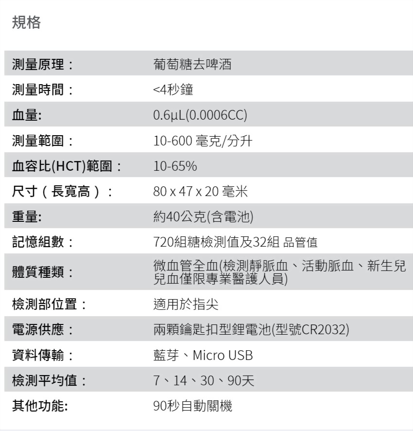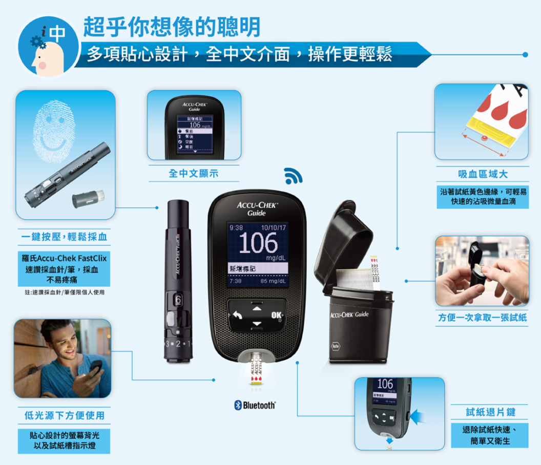 羅氏智航血糖機 數量 : 加入詢價車 產品敘述 規格 功能和顏色 準確度優於ISO15197:2013注1 全中文介紹面(24種語言) 吸血區大 試紙退片鍵 個人化目標範圍設置(餐前及餐後) 4組檢測時間提示及餐後檢測提示 高/低血糖模式提示 & 百分比 同時顯示上一行血糖測試值 5種血糖標記 低光源下方方便使用 注1 : 參考資料 依據ISO 15197:2013規範,當大型生物儀器檢測值小於100 mg/dL時, 95%的血液糖機檢測值會在±15 mg/dL之間,當大型生化儀檢測值大於100 mg/dL時, 95%的血糖機檢測值會在±15% mg/dL之間。 相關產品 FreeStyle Libre2 輔理善瞬感2 艾康血糖機 Model : on call plus 血糖機 (多種品) 優安進血糖機 Model : 優安進 羅氏逸智血糖機 美國ACON艾易康血糖機 Model : OGM-191