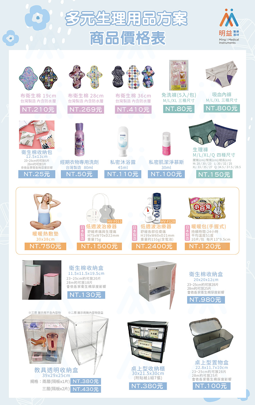 衛生棉收納包12.5x13cm 參考價 : $25 數量 : 加入詢價車 產品敘述 尺寸:約12.5x13cm 衛生棉23~25cm約可放5片 衛生棉28m約可放3片 實際會依各家衛生棉厚度影響 相關產品 教學娃娃(含衣物) 衛生棉-蘇菲超熟睡褲(2片/包)XL 初經寶盒輕量版 生殖系統圖解教學卡 生理用品-400元F方案 臀部模型支架