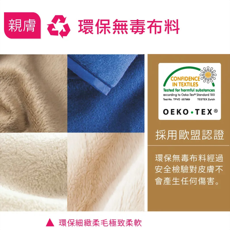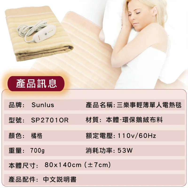 Sunlus三樂事 輕薄單人電熱毯 熱敷墊(80x140cm) 型號 : SP2701OR 數量 : 加入詢價車 產品敘述 規格 尺寸:80x140cm 材質:環保鵝絨布料 重量:700g 額定電壓:110V/60Hz 相關產品 急速冰袋 10x18cm(一敲即冷). Sunlus三樂事 頸肩雙用柔毛熱敷墊 電熱毯(50x50cm)... Model : SP1213 德國博依熱敷墊 電熱毯(舒活透氣型) Model : HK COMFORT SUMO舒摩 熱敷墊 電熱毯 14x27英寸(35x67公分) 德國博依熱敷墊 電熱毯(特易固型) Model : HK55 冰枕 (大)31x17cm(凝膠)