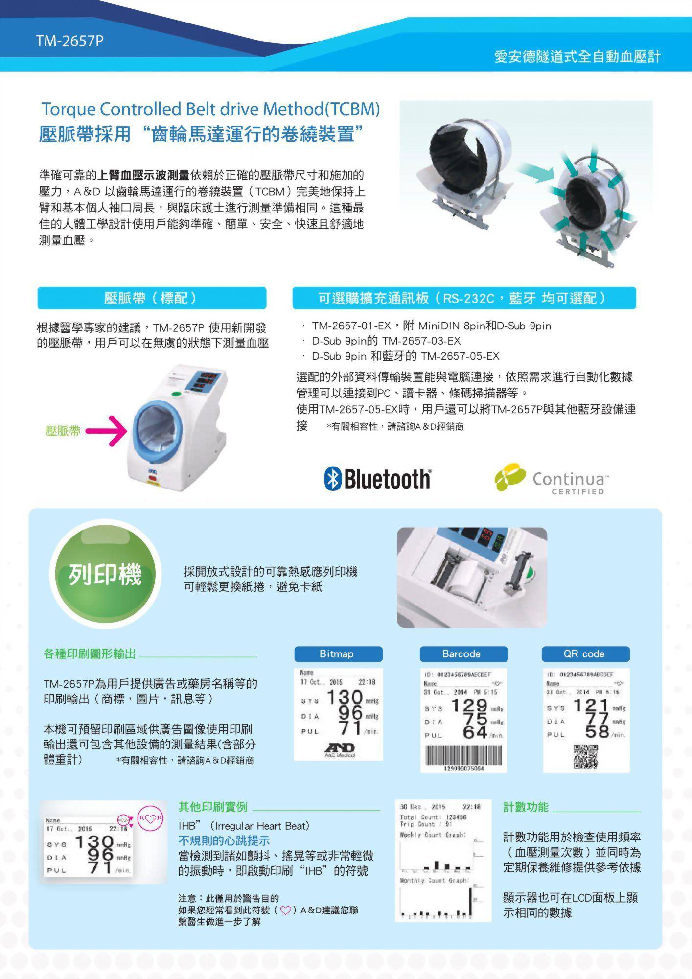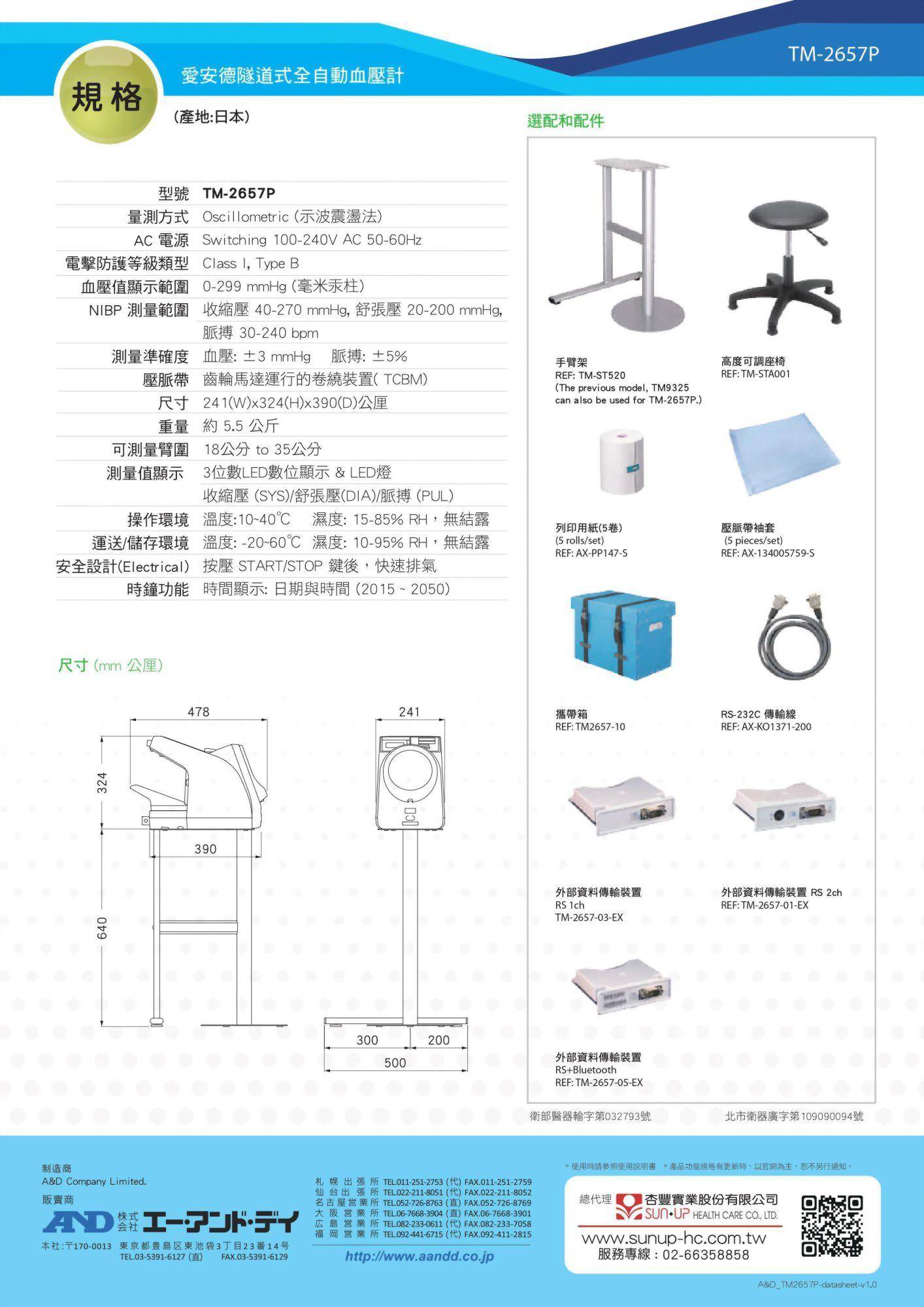 AND愛安德 隧道式全自動血壓計 TM-2657P 型號 : TM-2657P 數量 : 加入詢價車 產品敘述 規格 自動調整壓脈帶尺寸 左臂或右臂皆可測量 支架無障礙設計 測量範圍: 壓力:0-299mmHg 收縮壓:40-279mmHg 舒張壓:20-200mm-g 脈搏:30-240次/分鐘 外型尺寸:約W241xH324xD390mm 重量:約5.5kg 自動調整壓脈帶尺寸 左臂或右臂皆可測量 纖薄的直立式機身,節省空間,易於使用 支架無障礙設計,孕婦、背部問題患者和輪椅患者也可輕鬆使用 衛部醫器輸字第032793號 北市衛器廣字第109090094號 相關產品 血壓計球(壓脈球) 歐姆龍 藍牙電子血壓計 HEM-7155T(越南製) Model : HEM-7155T 愛安德 電子血壓計 UA-651Plus Model : UA-651Plus NISSEI 電子血壓計 WS-20J 歐姆龍 藍牙血壓計 HEM-7143T1(越南製) Model : HEM-7143T1 歐姆龍 隧道式血壓計 HEM-1000 Model : HEM-1000