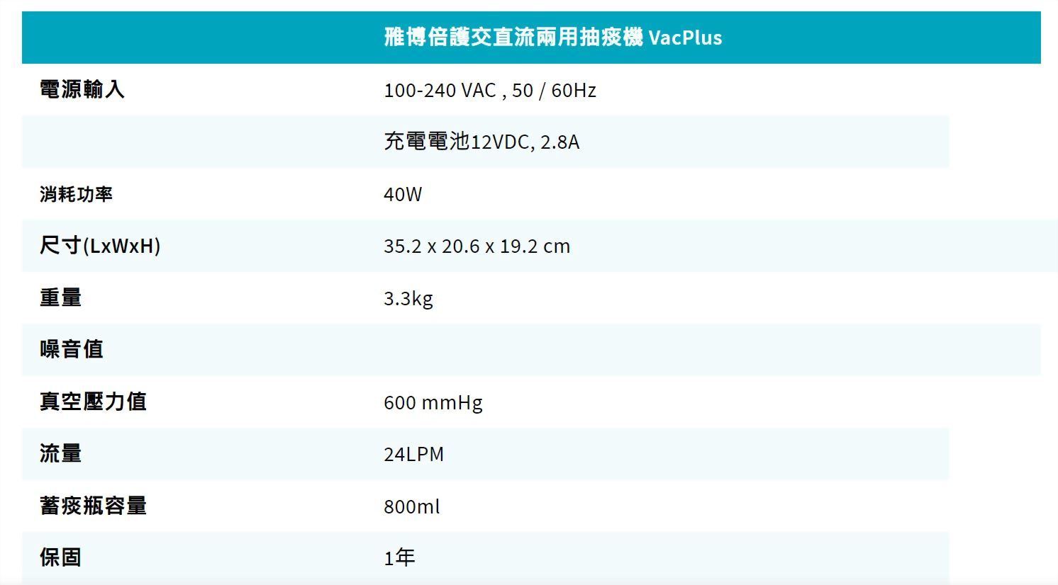 VacPlus抽痰機的最大抽吸力可達 600 mmHg,最大抽吸量可達 24 LPM(升/每分鐘),